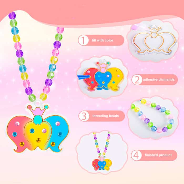 Ten bogaty zestaw wisiorków zawiera 6 wzorów, 6 różnych kolorów, 6 łańcuszków do wisiorków, 1 pęsetę, 1 paczkę diamentów, 1 paczkę kolorowych koralików i 1 dłuższy sznurek!