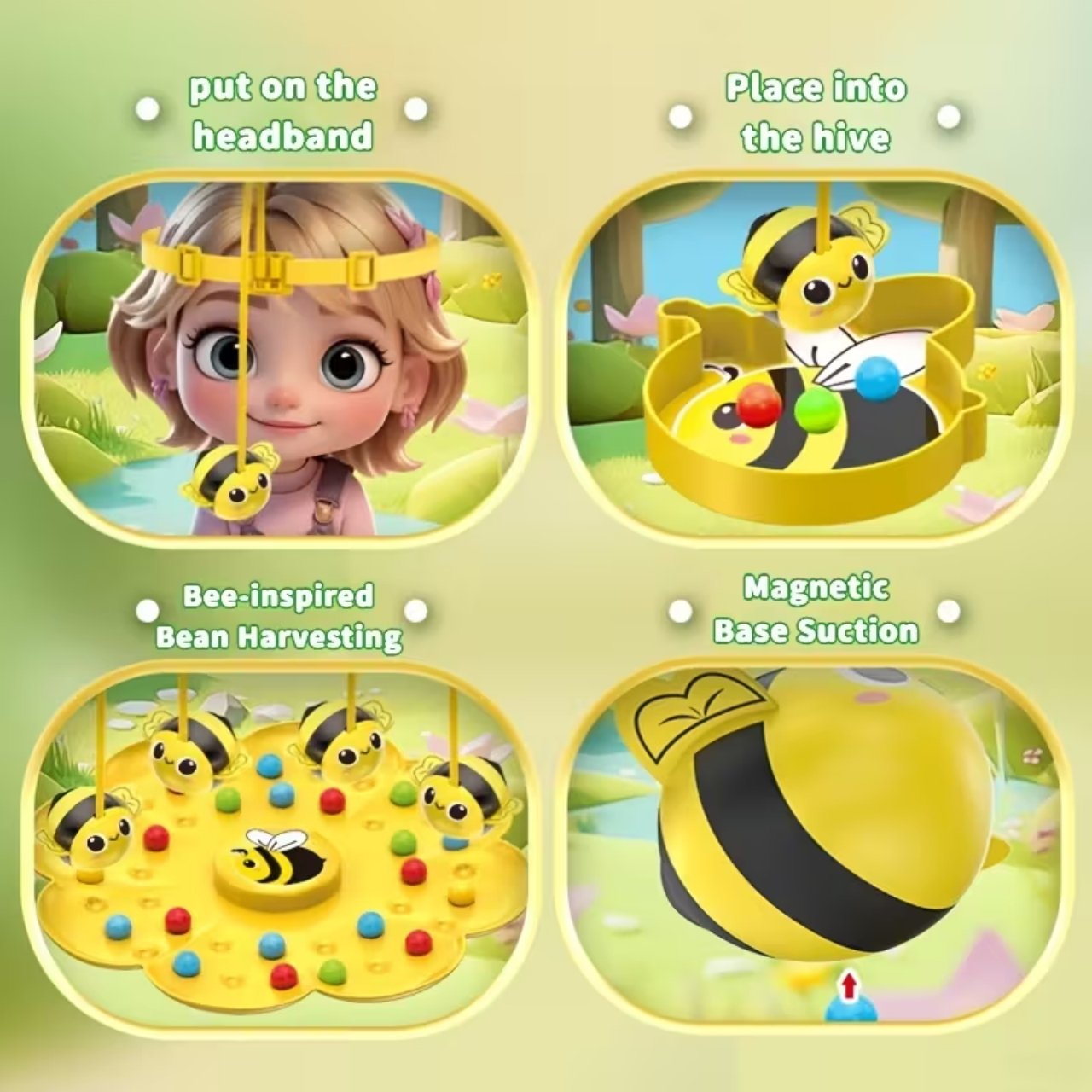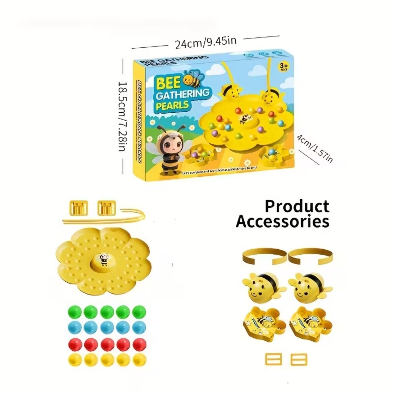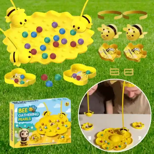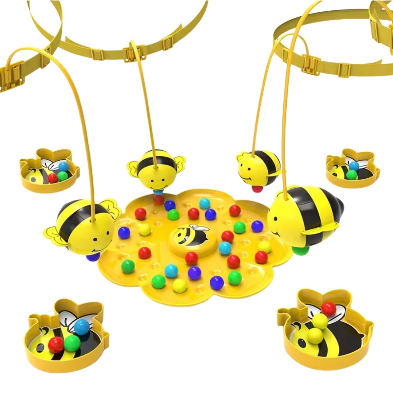 | W opakowaniu: | 1x plansza do gry, 4x kubek na kulki, 4x opaska na głowę z magnetycznymi pszczołami, kolorowe kulki |