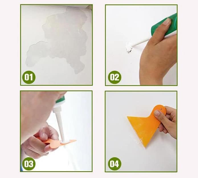 Po prostu wyciśnij magiczną pastę na uszkodzoną powierzchnię i rozprowadź równomiernie za pomocą dołączonej szpatułki. Poczekaj, aż wyschnie, a następnie w razie potrzeby możesz wygładzić powierzchnię papierem ściernym. Naprawiona część ściany będzie solidna jak skała, możesz nawet wbić w nią gwóźdź lub go wkręcić - będzie się trzymał jak przybity!