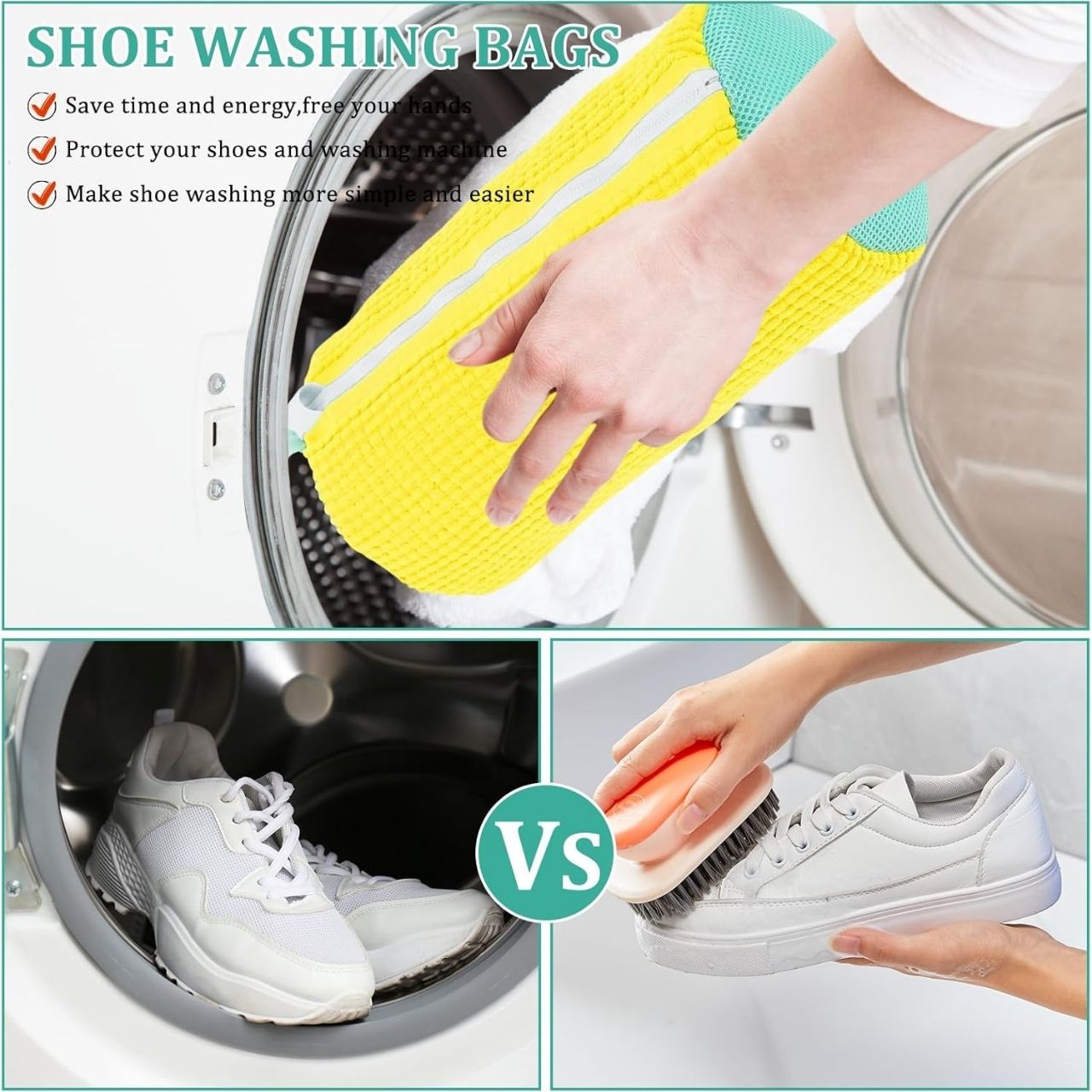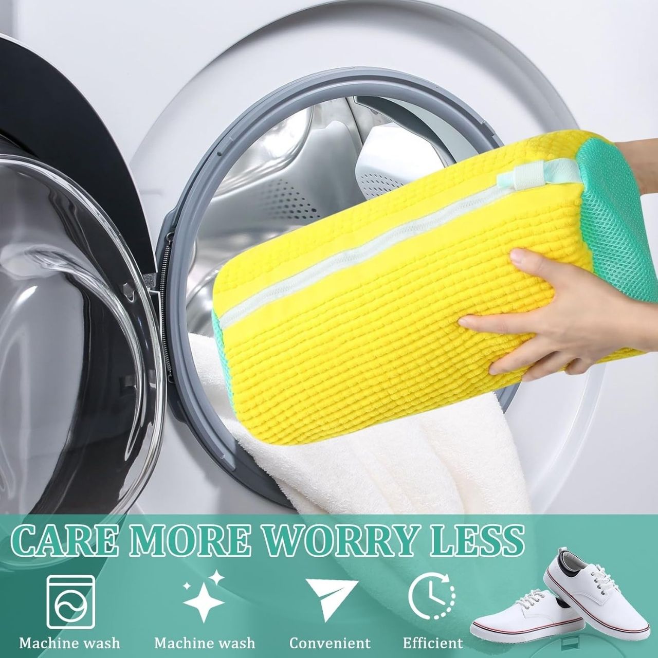 Gdy pierzesz buty razem z ubraniami, ShoeWash dba o to, aby Twoje ubrania pozostały bezpieczne i nieuszkodzone. Miękkie wewnętrzne włókna absorbują wstrząsy, zmniejszają tarcie i zapobiegają uszkodzeniu tkanin w bębnie przez buty.